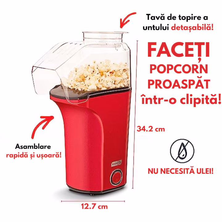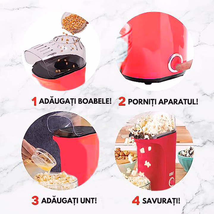 Rapid si Eficient: Datorita tehnologiei avansate cu aer cald, popcornul este pregatit rapid si uniform, fara riscul de a se arde sau de a ramane boabe.