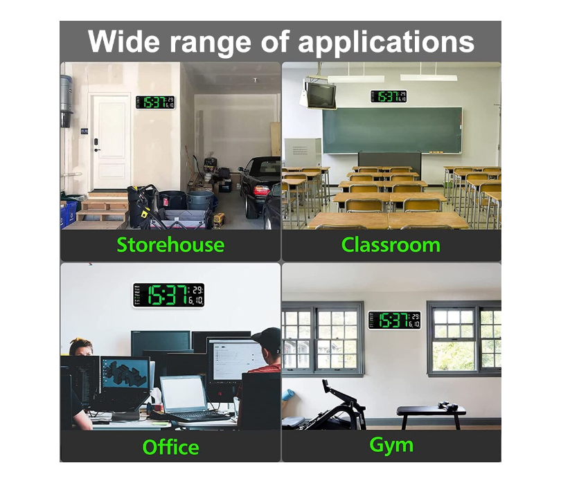 Ceas digital de perete AT PERFORMANCE®, cu un design modern și funcțional, este ideal pentru a adăuga un plus de eleganță și utilitate oricărei încăperi. Acesta vine cu afișaj LED verde clar și vizibil, care indică ora, data și temperatura, facilitând citirea informațiilor din orice unghi sau la orice moment al zilei. Carcasa sa neagră oferă un aspect minimalist și stilat, potrivindu-se perfect în birouri, săli de așteptare, locuințe sau chiar săli de sport. Funcționalitatea sa avansată îl face mai mult decât un simplu ceas, devenind un instrument util pentru cei care apreciază atât estetica, cât și performanța.