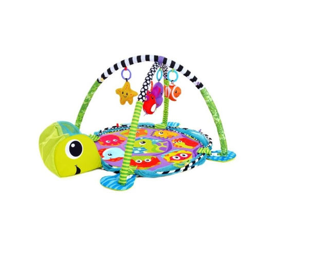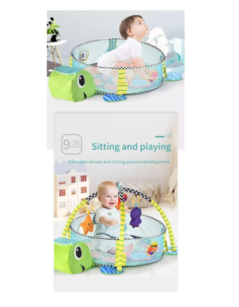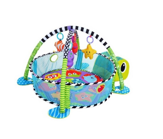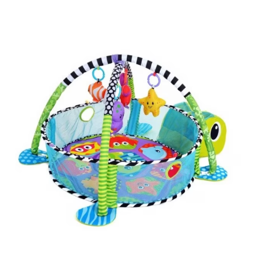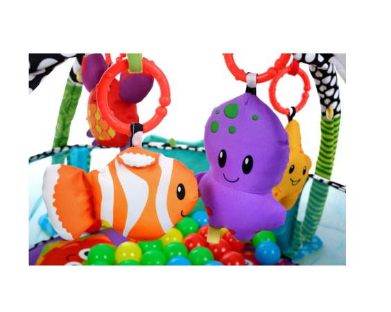- Patru jucarii care se pot conecta si partile laterale din plasa pop-up distreaza si inconjoara micii miscatori si agitatori! Aceasta covoras de gimnastica unica se transforma, de asemenea,
