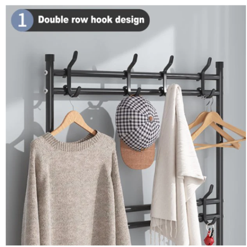 - Suportul are in partea superioara doua bare pe care culiseaza agatatorile pentru haine si cinci rafturi in parte inferioara pe care se pot depozita diverse articole.