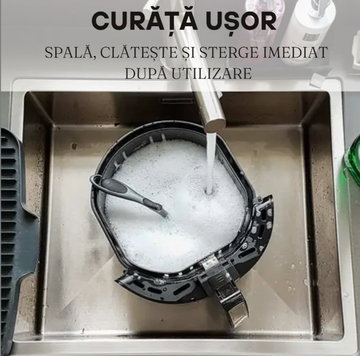 - Sterge air fryer-ul cu o carpa umeda si uscata. Asigura-te ca il cureti bine si indepartezi orice urma de sapun sau solutie de curatare.