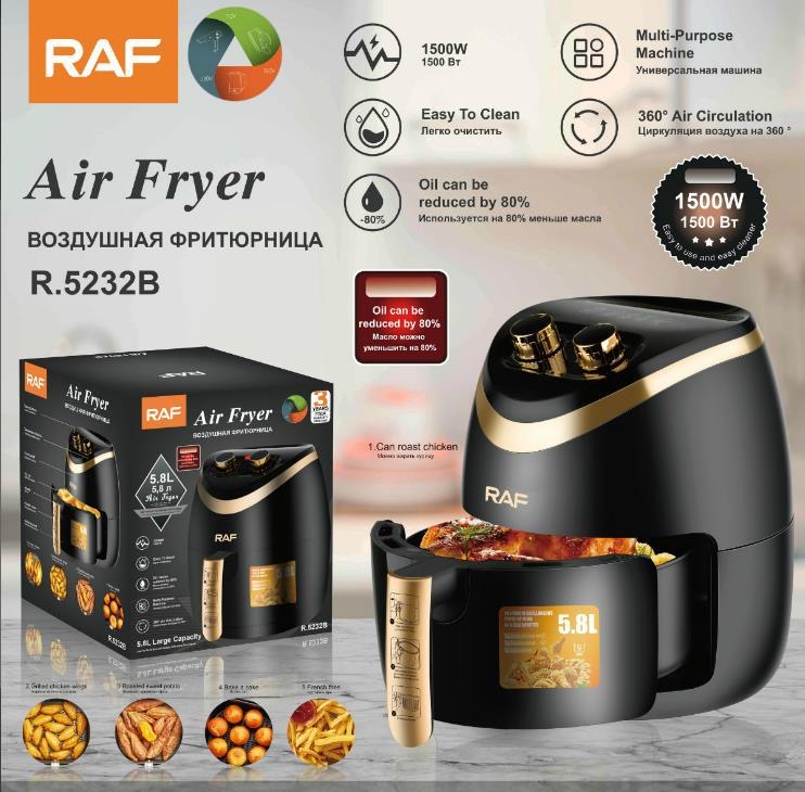 Friteuza electrica profesionala Air Fryer alb, AT PERFORMANCE®, RAF Air Fryer 5.8L 1500W Manual, Multi-Purpose, 360 Air Circulation R.5232 – Gatit sanatos si eficient pentru intreaga familie, negru