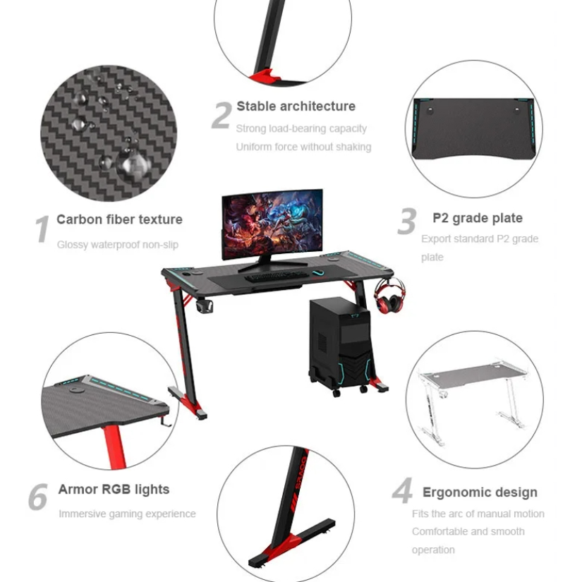 Masa profesionala gaming cu acoperire fibra de carbon si cu iluminat LED, ofera experienta de joc pe care o doriti. Suportul penru pahar si cele 2 gauri pentru cabluri asigura o joaca cu adevarat confortabila, iar suportul lateral asigura ca castile sa fie mereu la indemana. Masa este echipata cu iluminat LED cu 4 modele care ii confera un aspect cu adevarat profesional, iar scheletul si dimeniunile sale asigura stabilitate imbunatatind senzatia de confort in timpul utilizarii.