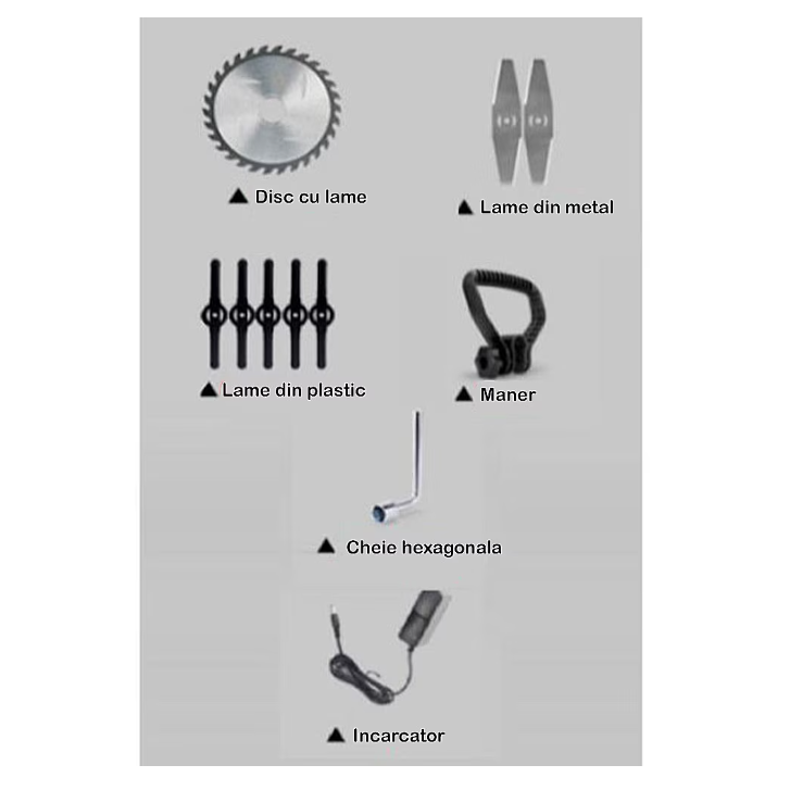 1 x Alimentator priza 1 x Motocoasa 1 x Disc taiere 1 x Protectie 1 x Maner 1 x Cheie reglaj 1 x Acumulator 24V |