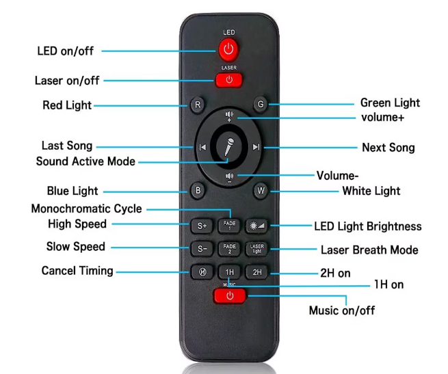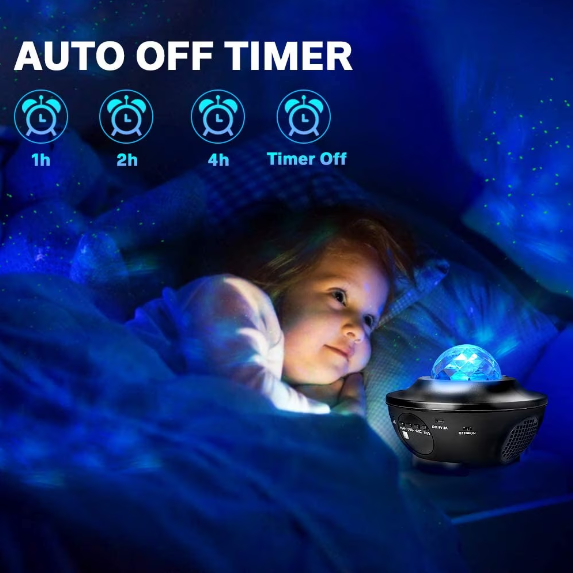 Produsul are telecomanda si temporizator de oprire automata. Asadar puteti schimba modurile pentru a va personaliza experienta. Puteti sa alegeti fie valurile oceanului, fie stelele sau ambele. Proiectorul isi poate schimba culorile, viteza de afisare si luminozitatea. De asemenea puteti regla volumul muzicii.