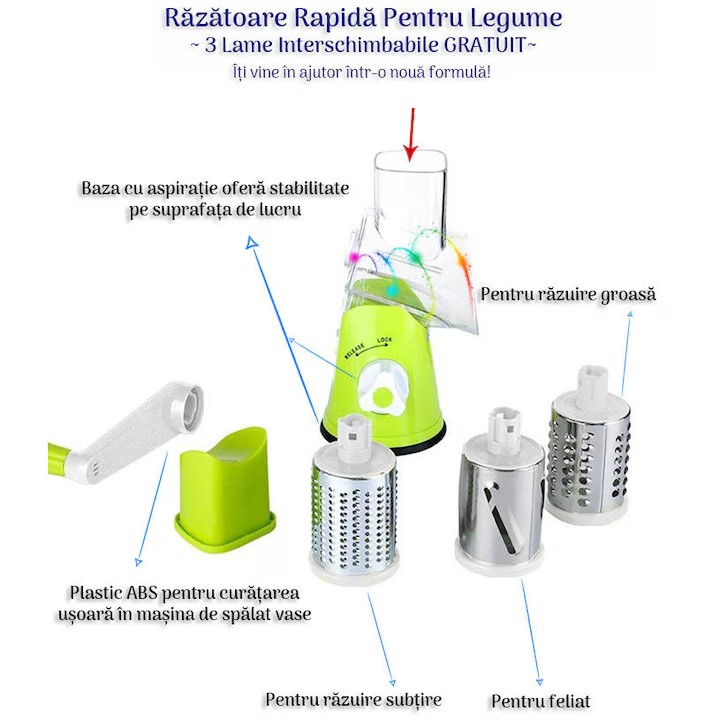 Este un accesoriu manual, mic si simplu, care va felia sau razui ingredientele in cel mai scurt timp cu aproape zero efort.