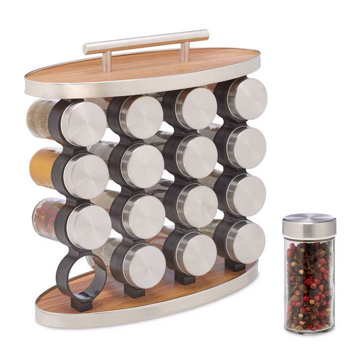 Cu acest organizator de condimente de sine statator puteti pastra bucataria ordonata. 16 recipiente pentru condimente va pastreaza colectia de condimente mereu la indemana. Borcanele de condimente sunt distribuite pe 4 nivele pentru a economisi spatiu si pot fi folosite direct ca agitator de condimente datorita insertiilor lor de stropire. Datorita designului deschis si manerului practic de transport, condimentele sunt la indemana atat atunci cand gatiti, cat si la masa. Designul decorativ cu aspect atractiv din lemn atrage ochiul tuturor.