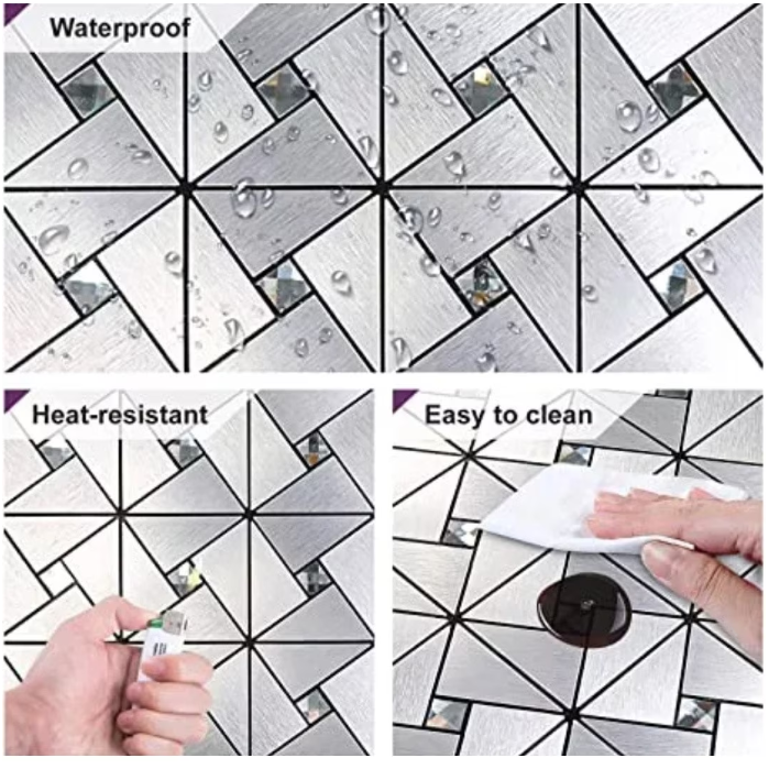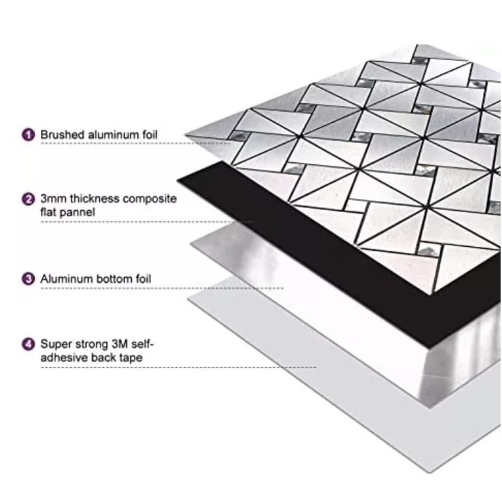 - Placa de autocolant are dimensiunea de 30 x 30 cm iar partea de decor este din aluminiu compozit in nuanta argintie ce se imbina cu bucati de sticla.