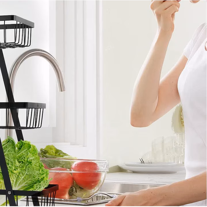 Cosul de organizare pentru legume cu 3 niveluri ajuta la minimizarea aglomeratiei si la maximizarea spatiului.